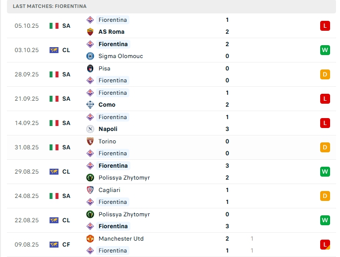 Fiorentina sau 6 trận đấu này, đội bóng này mang về 4 bàn thắng cùng hàng thủ nhận 8 bàn thua, 2/3 trận vừa qua của Fiorentina khép lại không quá 2 bàn thắng, khi xa nhà ở 4/5 trận gần nhất không quá 2 lần lưới rung.
