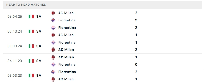 Quá khứ đối đầu AC Milan vs Fiorentina