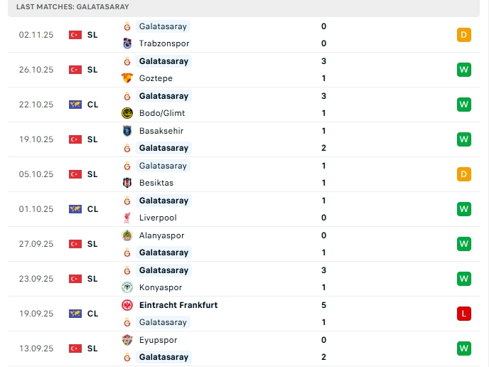Galatasaray  là đại diện đến từ Thỗ Nhĩ Kỳ, sau 3 trận đấu hàng công của họ mang về 5 bàn thắng cùng hàng thủ nhận 6 bàn thua , 2/3 trận đấu đó của Galatasaray khép lại từ 3 bàn trở lên, khi thi đấu xa nhà  ở 3/5 trận gần nhất cũng có kết quả tương tự.