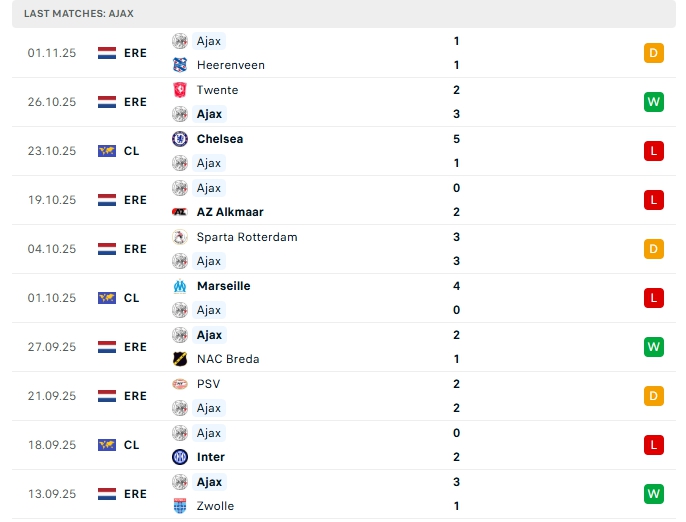 Ajax sau 3 lượt trận hàng công mang về 1 bàn thắng cùng hàng thủ chơi tệ khi nhận 11 bàn thua, 2/3 trận đấu đó của đại diện Hà Lan khép lại từ 3 bàn trở lên, hàng thủ đang chơi tệ khiến Ajax đang gặp nhiều khó khăn, trên sân nhà Ajax ở cả 5 trận gần nhất họ đều để các đối thủ chọc thủng lưới.