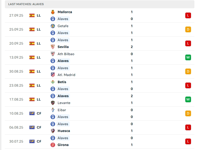 Alaves ở vòng đấu gần nhất, họ nhận thất bại 0-1 trước Mallorca, đây là trận không thắng thứ 3 liên tiếp với 2 thất bại và 1 hòa, sau 7 lượt trận Alaves có cho mình 2 chiến thắng, 2 hòa và 3 thất bại, mang về 8 điểm và đang xếp vị trí thứ 11 trên BXH, phong độ thời gian qua của Alaves là không tốt, họ chỉ thắng 2 ở 10 trận gần nhất, trên sân nhà của mình Alaves cũng đang chơi tệ khi chỉ thắng 1, hòa 1 và thua 3 ở 5 trận gần nhất.