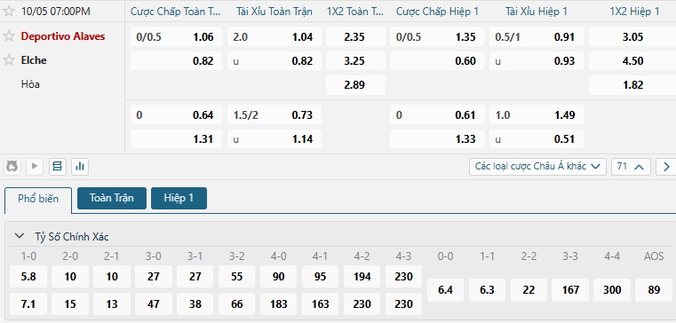 Bảng tỷ lệ kèo bóng đá trận đấu Alaves vs Elche