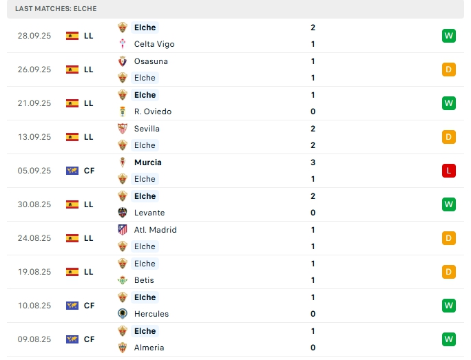 Elche ở 7 vòng đấu đầu tiên, hàng công mang về 10 bàn thắng cùng hàng thủ nhận 6 bàn thua, 3/5 trận vừa qua của Elche khép lại 90 phút không quá 2 bàn thắng, khi thi đấu xa nhà ở 3/5 trận gần nhất khép lại không quá 2 bàn.