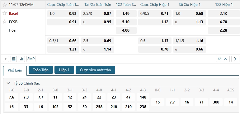 Bảng tỷ lệ kèo bóng đá trận đấu Basel vs Steaua Bucuresti