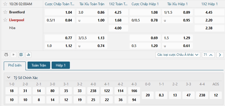 Kèo tỷ số trận Brentford vs Liverpool