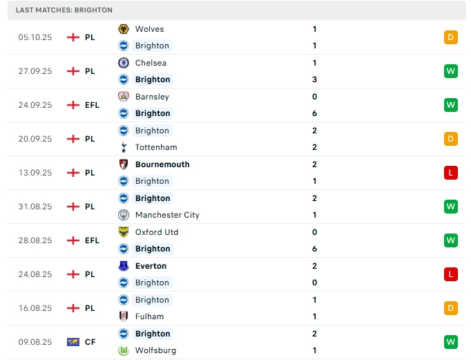 Brighton ở 7 vòng đấu đầu tiên, họ mang về 2 chiến thắng,3 hòa và 2 thất bại, họ có được 9 điểm và đang xếp vị trí 12 trên BXH, ở trận gần nhất Brighton có trận hòa 1-1 trước Wolves, đây là trận bất bại thứ 4 liên tiếp của họ, trong đó có 2 chiến thắng, phong độ thời gian qua của Brighton là khá tốt, đặc biệt trên sân nhà họ đang duy trì mạch bất bại lên đến con số 10 với 6 chiến thắng.