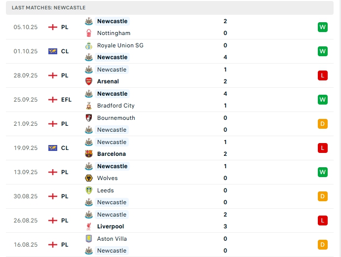 Newcastle sau 7 lượt trận đội bóng này có cho mình 6 bàn thắng cùng hàng thủ nhận 5 bàn thua, 3/5 trận vừa qua của họ khép lại từ 3 bàn thắng trở lên, khi thi đấu xa nhà ở Newcastle đang chơi chắc chắn, 3 trận gần nhất ở đấu trường Ngoại Hạng Anh của họ đều khép lại với không bàn thắng.