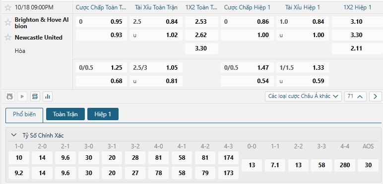 Bảng tỷ lệ kèo bóng đá trận đấu Brighton vs Newcastle