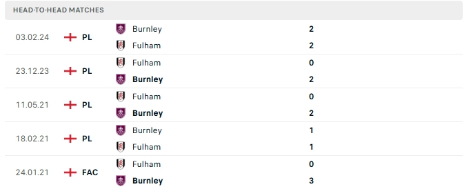 Những màn đụng độ giữa Burnley và Fulham thường diễn ra chặt chẻ với ít bàn thắng được tạo ra, cụ thể ở 3/5 lần gặp nhau gần nhất của hai đội khép lại không quá 2 lần lưới rung.