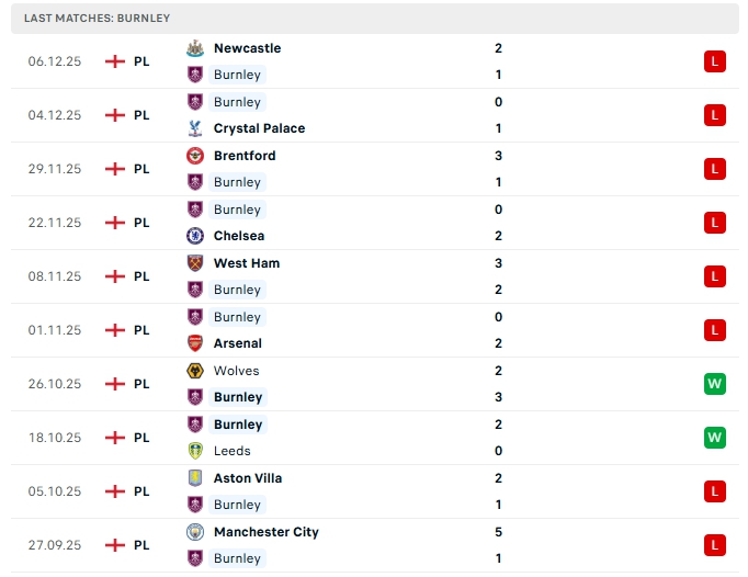 Burnley sau 15 vòng đấu, đội bóng này mang về 3 chiến thắng, 1 hòa cùng 11 thất bại, có được 10 điểm và đang xếp vị trí thứ 19 trên BXH, một vị trí trong nhóm cầm đèn đỏ, ở vòng đấu gần nhất Burnley nhận thất bại 1-2 trước Newcastle, trận thua này là trận thua thứ 6 liên tiếp của đội bóng này, phong độ thời gian qua của Burnley là không tốt, trên sân nhà Burnley cũng chơi tệ khi chỉ thắng 1, thua 4 ở 5 trận gần nhất.