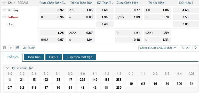 Kèo tỷ số trận Burnley vs Fulham