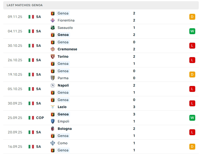 Bên kia sân, Genoa sau 11 trận đấu, đội bóng này mang về 7 điểm và đang xếp vị trí thứ 18 trên BXH, một vị trí trong nhóm cầm đèn đỏ, ở vòng đấu gần nhất, Genoa có trận hòa trước Fiorentina, đây là trận bất bại thứ 2 liên tiếp, dù vậy khi xa nhà Genoa đang chơi tệ với chỉ 1 chiến thắng, 3 thất bại cùng 1 hòa sau 5 trận đấu.