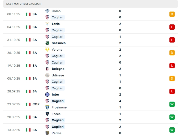 Cagliari sau 11 trận đấu họ mang về 10 điểm với 2 chiến thắng, 4 hòa và 5 thất bại, đang xếp vị trí thứ 14 trên BXH, ở vòng đấu gần nhất, Cagliari chỉ có trận hòa trước Como, đây là trận không thắng thứ 7 của đội bóng này, trong đó có 4 thất bại cùng 3 hòa, trên sân nhà Cagliari cũng đang chơi tệ khi thua 3 trận liên tiếp vừa qua.