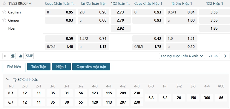 Kèo tỷ số trận Cagliari vs Genoa