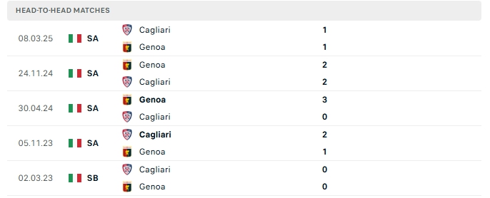 Phong độ thi đấu gần đây Cagliari vs Genoa