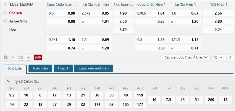 Kèo tỷ số trận Chelsea vs Aston Villa
