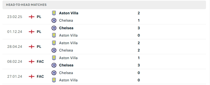 Quá khứ đối đầu Chelsea vs Aston Villa