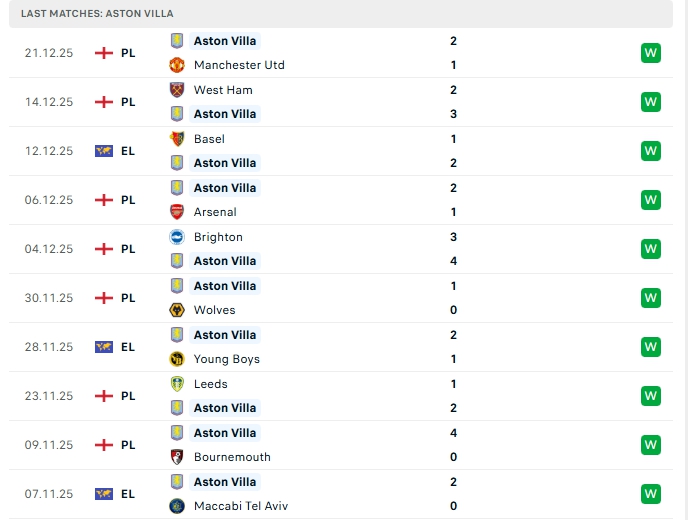 Bên kia sân, Aston Villa sau 17 trận đấu họ mang về 11 chiến thắng, 3 hòa cùng 3 thất bại, có được 36 điểm và đang xếp thứ 3 trên BXH, Đội chủ sân Villa Park vừa có chiến thắng 2-1 trước Man Utd để duy trì chuỗi 10 chiến thắng liên tiếp trên mọi đấu trường, phong độ thời gian qua của Aston Villa là cực kỳ ấn tượng, khi xa nhà đội bóng này cũng toàn thắng ở 4 trận gần nhất.