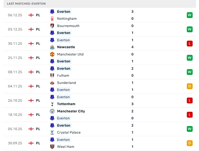 Everton ở 15 lượt trận, đội bóng này có được 18 bàn thắng cùng hàng thủ nhận 17 bàn thua, lối chơi của Everton thiên về phòng ngự nên không bất ngờ những trận đấu của đội bóng này không có nhiều bàn thắng xuất hiện, 3/5 trận vừa qua của Everton khép lại không quá 2 bàn, khi xa nhà ở cả 5 trận vừa qua của họ khép lại không quá 2 lần lưới rung.