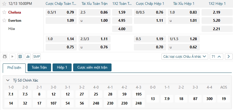 Kèo tỷ số trận Chelsea vs Everton