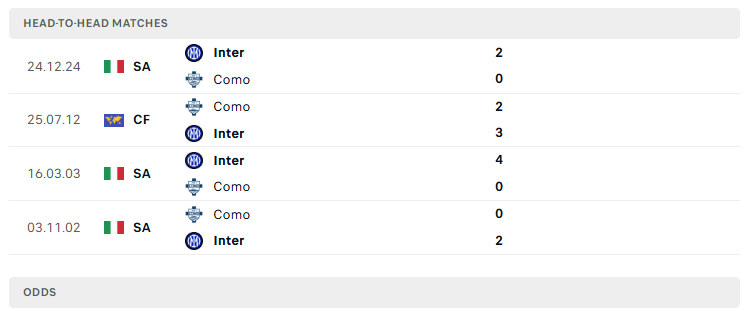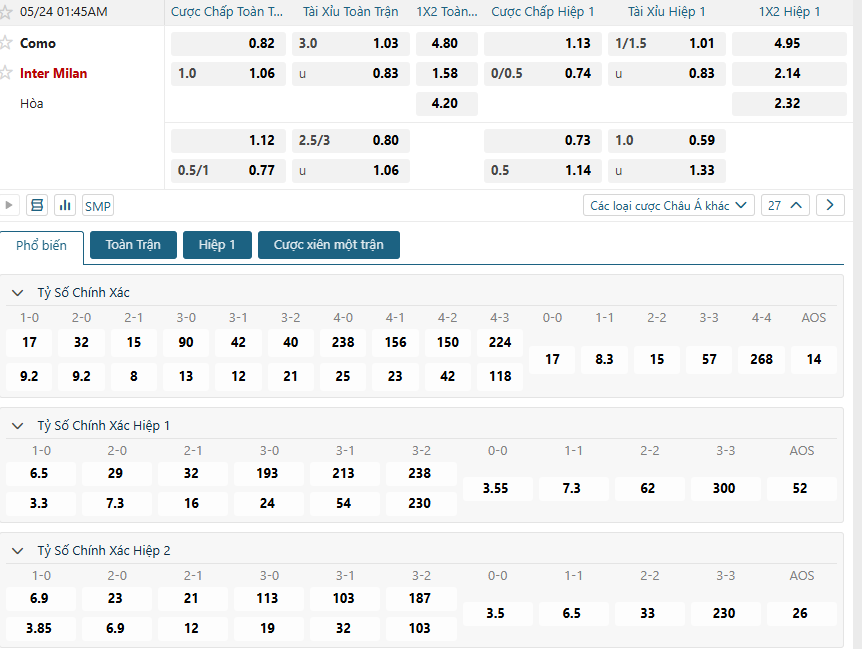 Bảng tỷ lệ kèo bóng đá trận đấu Como vs Inter Milan