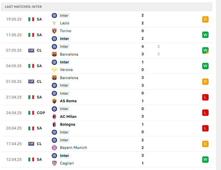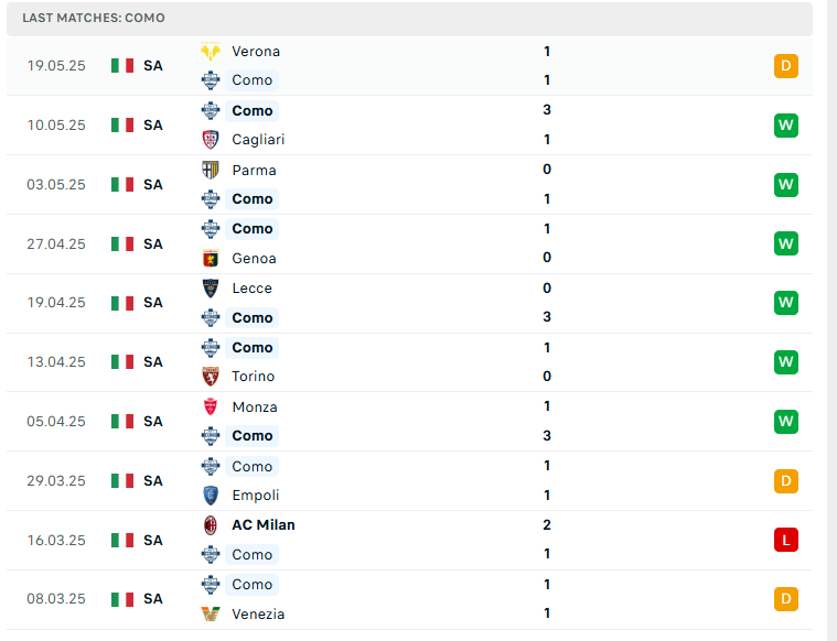 Phong độ thi đấu gần đây Como vs Inter Milan