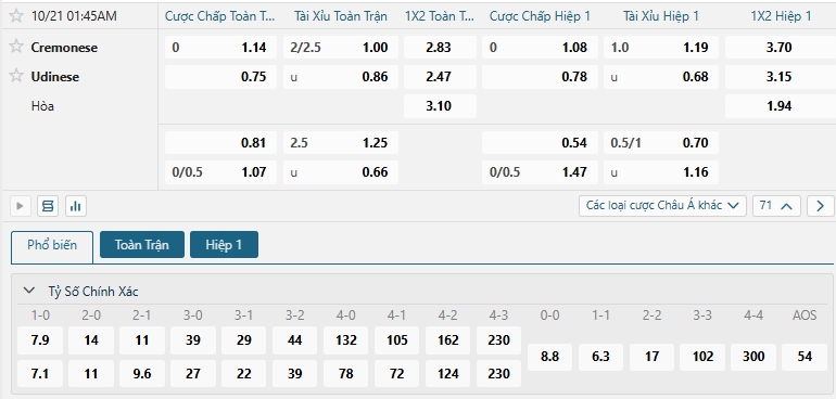 Bảng tỷ lệ kèo bóng đá trận đấu Cremonese vs Udinese
