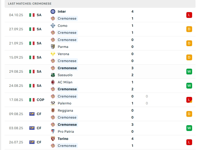 Cremonese ở 6 vòng đấu đầu tiên, họ mang về 2 chiến thắng, 3 hòa cùng 1 thất bại, họ có được 9 điểm và đang xếp vị trí 10 trên BXH, ở trận gần nhất Cremonese nhận thất bại đậm 1-4 trước Inter Milan, đây là trận không thắng thứ 4 liên tiếp trong đó có 3 hòa, dù vậy phong độ thời gian qua của Cremonese được cho là khá tốt, họ chỉ thua 1 ở 5 trận vừa qua, trên sân nhà thắng 1 và hòa 1 sau 2 trận đấu.