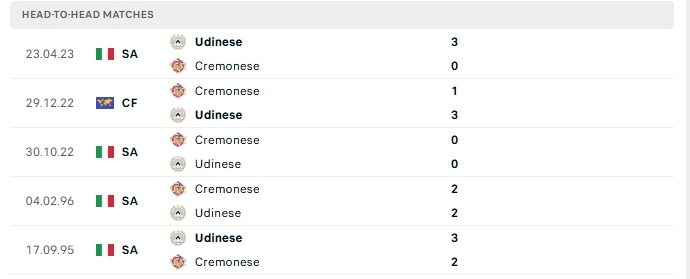 Quá khứ đối đầu Cremonese vs Udinese