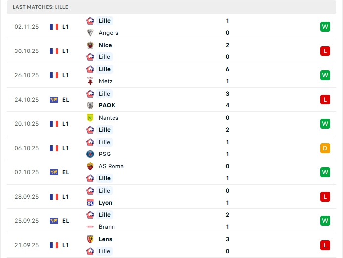 Lille là đại diện đến từ Pháp, sau 3 lượt trận hàng công mang về 6 bàn thắng, cùng hàng thủ nhận 5 bàn thua, 2/3 trận đấu đó khép lại trên 3 bàn thắng, khi thi đấu xa nhà ở 3/5 trận gần nhất của họ khép lại không quá 2 bàn.