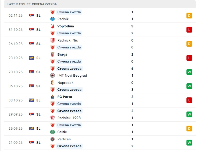 Crvena Zvezda sau 3 lượt trận đại diện Serbia có được 2 bàn thắng trong đó hàng thủ nhận 5 bàn thua, 2/3 trận đấu đó khép lại không quá 2 bàn thắng, trên sân nhà của mình Crvena Zvezda thường nhập cuộc với sự thận trọng mỗi khi đối đầu với những đối thủ được đánh giá cao.