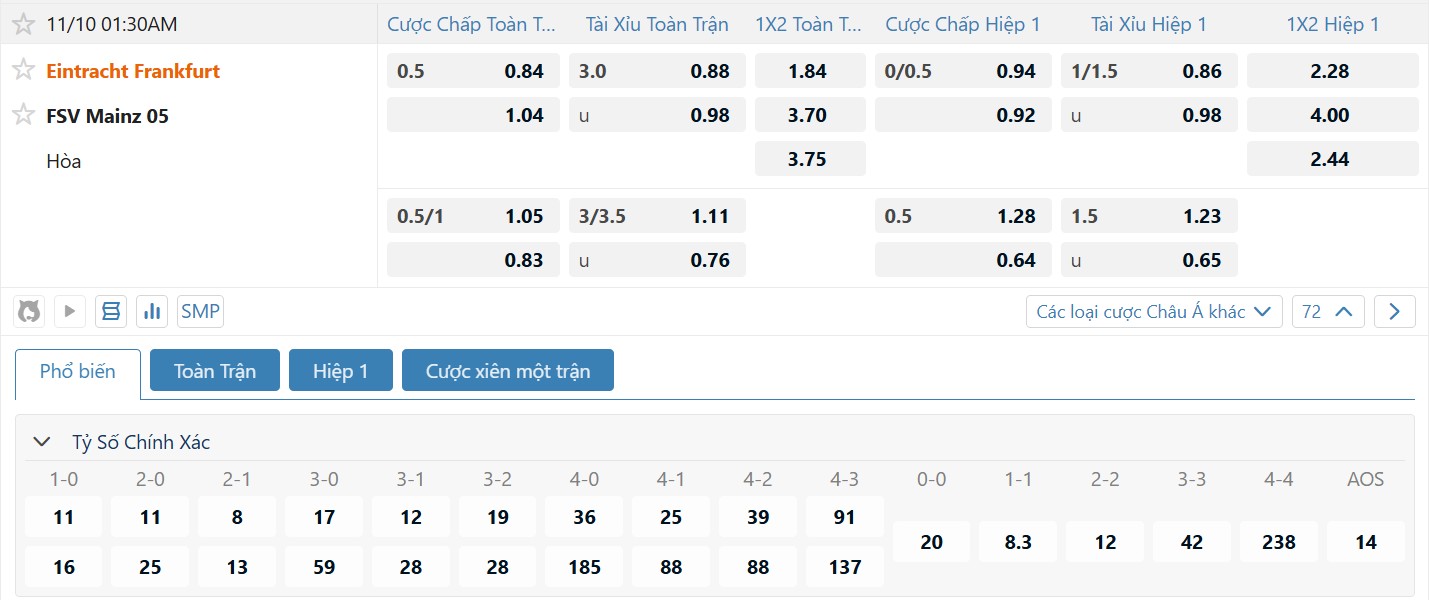 Bảng tỷ lệ kèo bóng đá trận đấu Eintracht Frankfurt vs Mainz