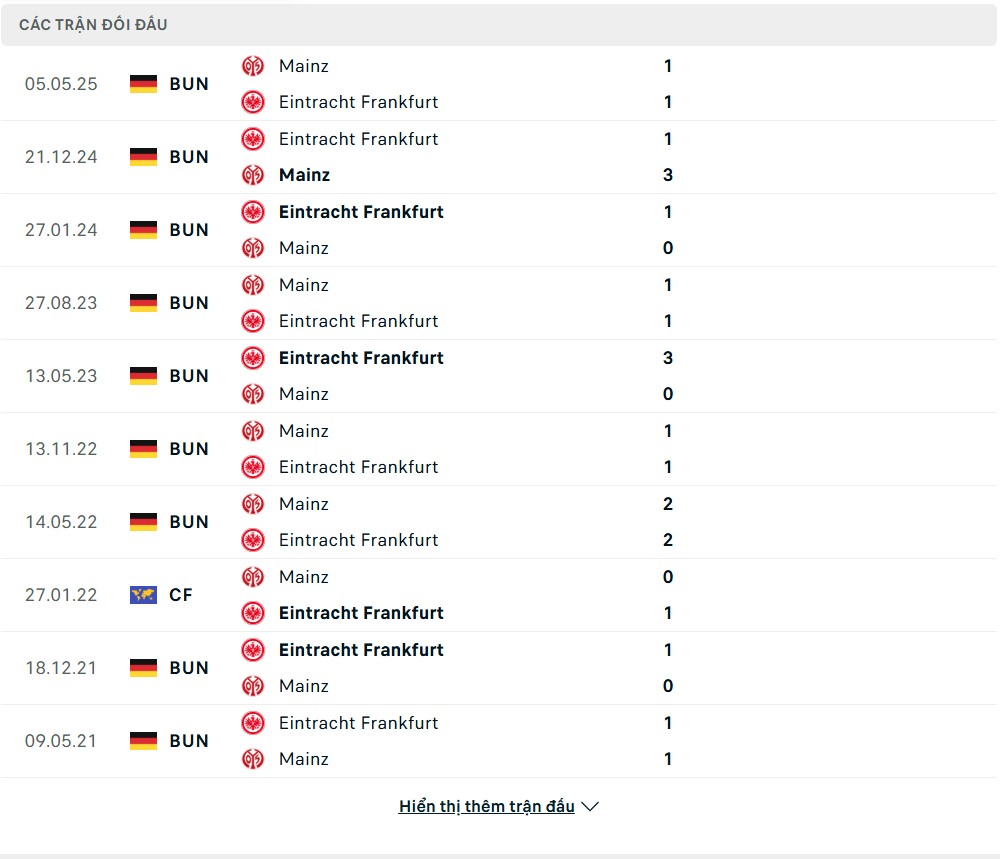 Quá khứ đối đầu Eintracht Frankfurt vs Mainz