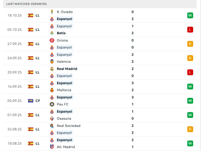 Espanyol đang có khởi đầu tốt ở mùa giải năm nay, sau 9 vòng đấu đội bóng này mang về 4 chiến thắng , trong đó hòa 3 và thua 2 trận, có được 15 điểm và đang xếp vị trí 6 trên BXH, ở vòng gần nhất Espanyol có chiến thắng 2-0 trước Real Oviedo, phong độ thời gian qua của Espanyol là không quá tốt, họ chỉ thắng 1 ở 5 trận gần nhất, dù vậy trên sân nhà Espanyol chơi ấn tượng với 3 chiến thắng, 1 hòa cùng 1 thất bại.