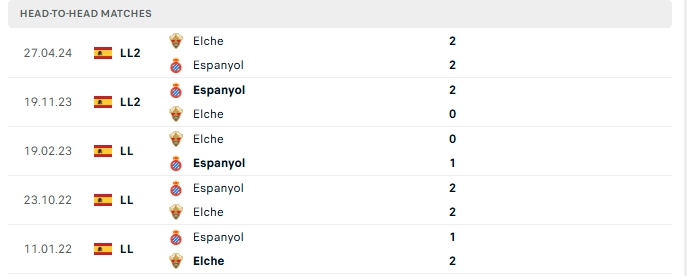 Những màn đụng độ giữa Espanyol và Elche diễn ra hấp dẫn với nhiều bàn thắng được tạo ra, 3/5 lần gặp nhau gần nhất của hai đội và 3/5 lần đón tiếp Elche trên sân của Espanyol khép lại trên 3 bàn, việc hàng công cả hai vẫn duy trì hiệu suất ghi bàn tốt, một trận đấu hứa hẹn hấp dẫn.