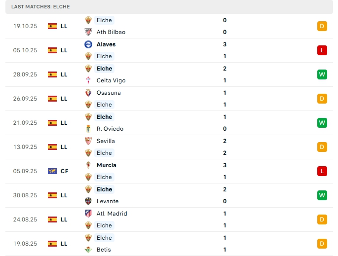 Bên kia sân, Elche, trận hòa gần nhất trước Ath Bilbao là trận thứ 2 không thắng của họ, sau 9 vòng đấu, cùng với 3 chiến thắng, 5 hòa và 1 thất bại, các vị khách có được 14 điểm và đang xếp vị trí thứ 7 trên BXH, kém 1 điểm so với đối thủ trong trận đấu này, phong độ thời gian qua của Elche là không tốt, đặc biệt khi xa nhà, Elche đang chơi tệ khi trải qua chuỗi 6 trận không thắng với 3 hòa cùng 3 thất bại.