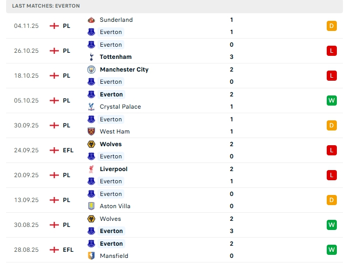 Everton sau 10 lượt trận đầu tiên, hàng công của đội bóng này mang về 10 bàn thắng cùng hàng thủ nhận 13 bàn thua, 3/5 trận vừa qua của Everton ở đấu trường Ngoại Hạng Anh khép lại không quá 2 bàn thắng, trên sân nhà của mình ở 3/5 vòng gần nhất cũng khép lại không quá 2 bàn.