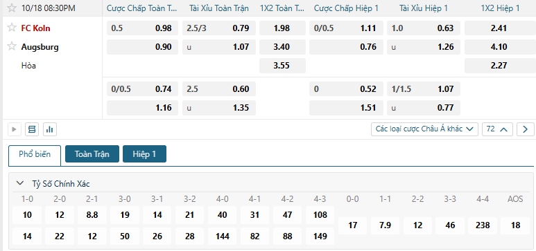 Bảng tỷ lệ kèo bóng đá trận đấu FC Koln vs Augsburg