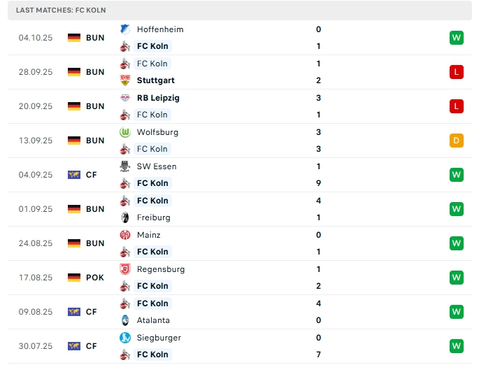 FC Koln sau 6 vòng đấu, đội bóng này mang về 3 chiến thắng, 1 hòa cùng 2 thất bại có được 10 điểm và đang xếp ở vị trí thứ 6 trên BXH, ở vòng đấu gần nhất FC Koln có chiến thắng trước Hoffenheim, đây là chiến thắng thứ 2 của họ ở 5 vòng gần nhất, phong độ thời gian qua trên sân nhà của FC Koln là khá tốt khi họ thắng 4 và chỉ thua 1 ở 5 trận.