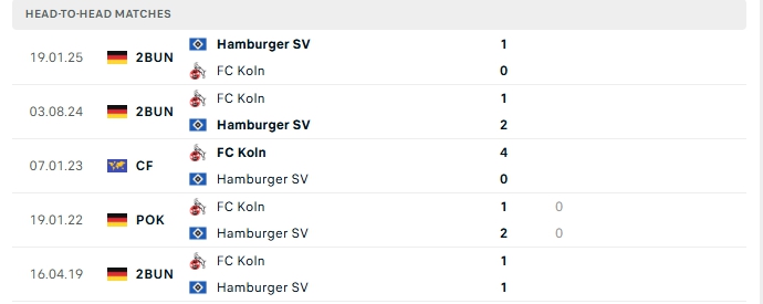 Những màn đụng độ giữa FC Koln và Hamburger thường diễn ra hấp dẫn với nhiều bàn thắng được tạo ra, cụ thể 3/5 lần gặp nhau gần nhất và 4/5 lần đón tiếp Hamburger trên sân của FC Koln khép lại trên 3 lần lưới rung