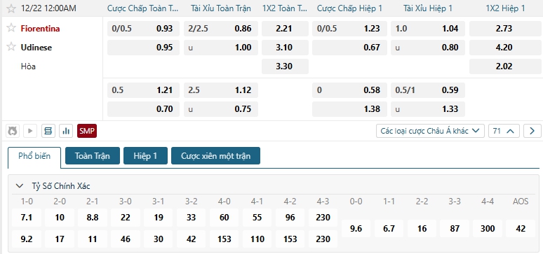 Kèo tỷ số trận Fiorentina vs Udinese