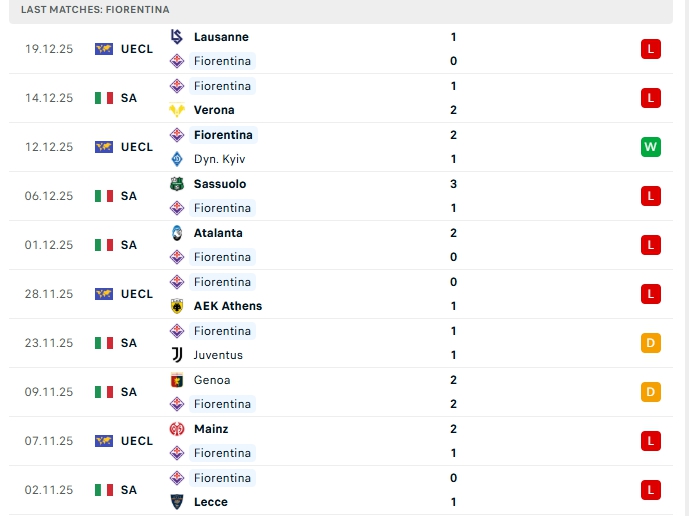 Fiorentina sau 15 trận đấu họ mang về 6 điểm cùng vị trí thứ 20 trên BXH, với 6 hòa và 9 thất bại, Fiorentina vừa nhận thất bại trước Lausanne ở đấu trường Conference League, đây là thất bại thứ 2 liên tiếp của họ và là thất bại thứ 4 ở 5 trận gần nhất, phong độ thời gian qua của Fiorentina là không tốt, trên sân nhà đội bóng này cũng chỉ thắng 1, hòa 1 và thua 3 ở 5 trận gần nhất.