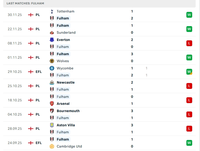 Fulham sau 13 lượt trận họ có 5 chiến thắng, 2 hòa và 6 thất bại, có được 17 điểm và đang xếp vị trí thứ 15 trên BXH, Fulham ở vòng đấu gần nhất họ có chiến thắng trước Tottenham, đây là trận thắng thứ 2 liên tiếp của đội bóng này, phong độ thời gian qua của Fulham là khá tốt, với 4 chiến thắng, 1 thất bại ở 5 trận gần nhất, trên sân nhà Fulham cũng có được 4 chiến thắng trong 5 trận.