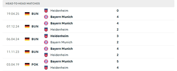 Những màn đụng độ giữa Heidenheim và Bayern Munich thường diễn ra hấp dẫn với nhiều bàn thắng được tạo ra, cụ thể ở 5 lần gặp nhau gần nhất của hai đội và cả 2 lần đón tiếp Bayern Munich trên sân của Heidenheim vượt mốc trên 3 bàn.