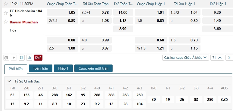 Bảng tỷ lệ kèo bóng đá trận đấu Heidenheim vs Bayern Munich