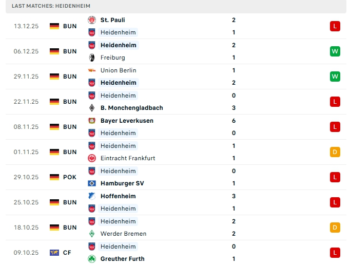Heidenheim sau 14 trận đấu, đội bóng này có cho mình 3 chiến thắng, 2 hòa cùng 9 thất bại, có được 11 điểm và đang xếp thứ 17 trên BXH,  ở vòng đấu gần nhất Heidenheim nhận thất bại 1-2 trước St. Pauli, thất bại này chấm dứt chuỗi 2 chiến thắng trước đó,  phong độ thời gian qua của Heidenheim đang không tốt họ chỉ thắng 2 ở 10 trận gần nhất, trên sân nhà Heidenheim cũng chỉ thắng 1 ở 5 trận vừa qua.