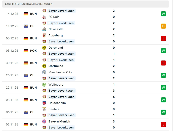 Bayer Leverkusen sau 14 trận đấu , hàng công chơi tốt khi mang về 30 bàn thắng, cùng hàng thủ nhận 19 bàn thua, hàng công đang chơi tốt, dù vậy hàng thủ cũng thiếu chắc chắn.