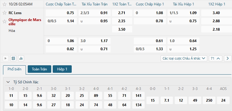 Nhà cái châu Á đang đánh giá cao khả năng chiến thắng của các vị khách Marseille là cao hơn so với Lens, khi đưa ra mức chấp đang là 0.25, dù phải thi đấu xa nhà nhưng với phong độ cùng thực lực được đánh giá cao hơn thì Marseille tự tin hướng đến chiến thắng cho mình, dù Lens sẻ ít nhiều đem đến khó khăn cho các vị khách nhưng Marseille vẫn tự tin hướng đến 3 điểm, lựa chọn Marseille cho kèo châu Á.