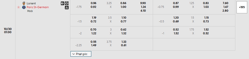 Bảng tỷ lệ kèo bóng đá trận đấu Lorient vs PSG