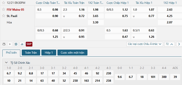 Bảng tỷ lệ kèo bóng đá trận đấu Mainz vs St. Pauli